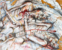 Larger-Than-Life. Works of nude figure art take on forceful poses as they wxplode across eight foot (and larger) canvases of paper, gesso and gold leaf infused abstraction and erotica.